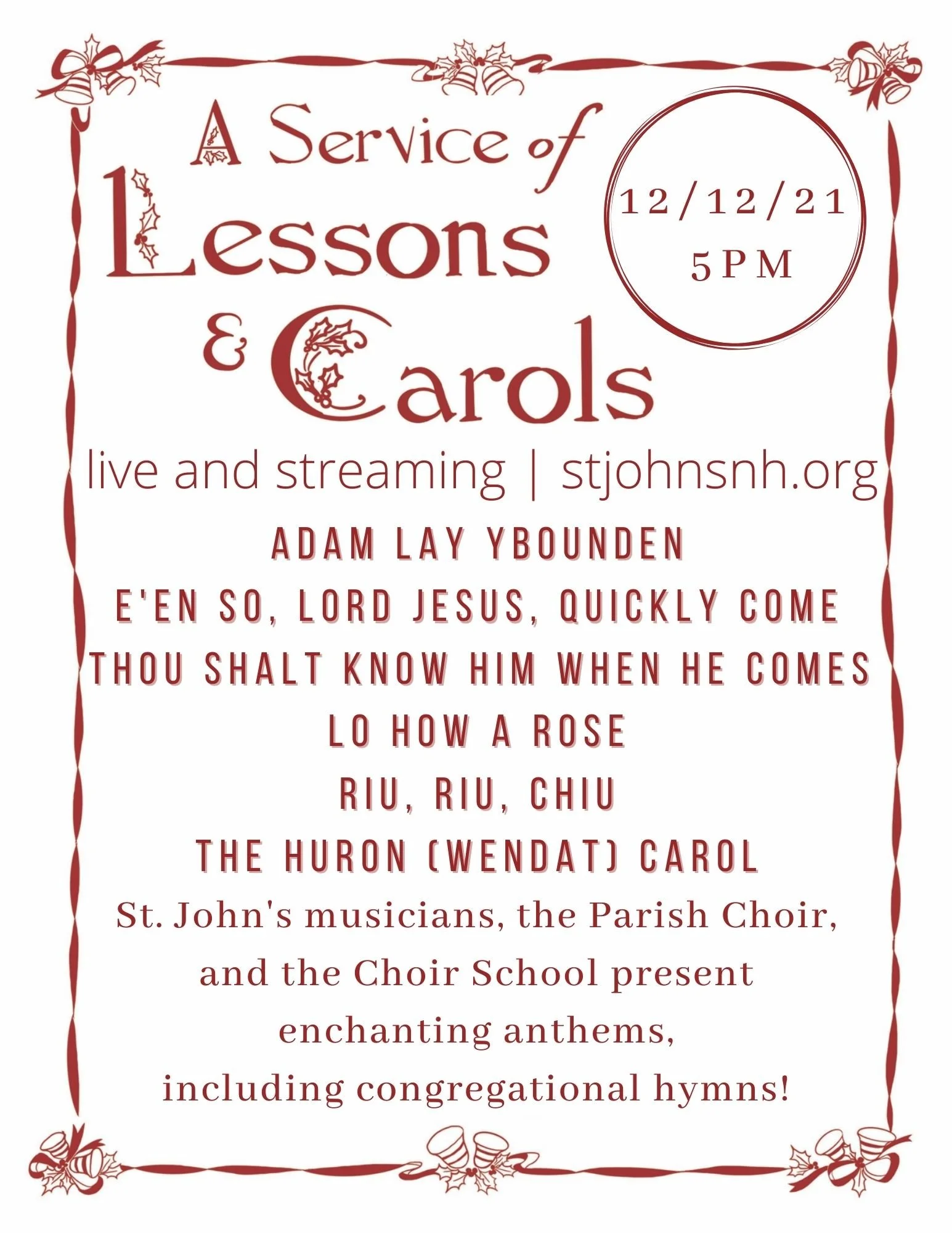 Featuring St. John's musicians, the Parish Choir, the Choir School, choral scholars, YOC student David Kenney Jr. as guest organist, and a premiere of an original arrangement of The Huron (Wendat) Carol by Olin Johannessen.