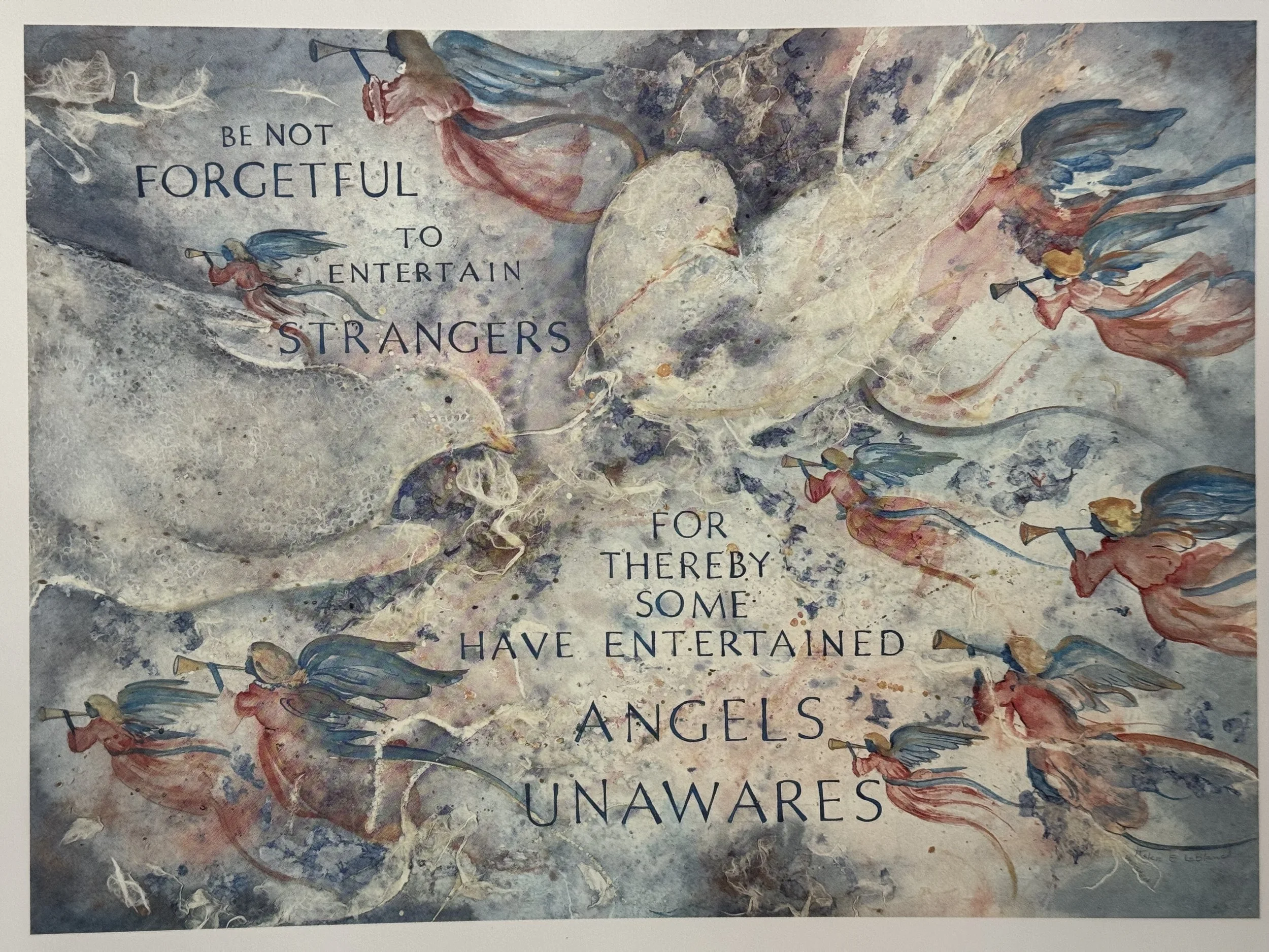 This beautiful artwork is from a signed and numbered print of the piece entitled "Angels Unawares," by the artist Helen LeBlanc of Wyandotte, MI.