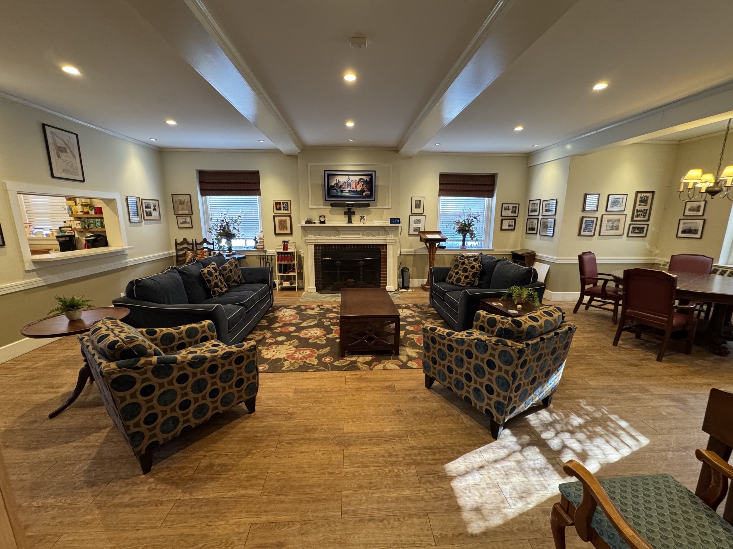 The Philbrick Room brings all the charm and warmth of home. Including a fireplace, French doors, kitchenette and an upright piano, this is great for baby or wedding showers, small birthday parties, book groups, or a meeting room.
