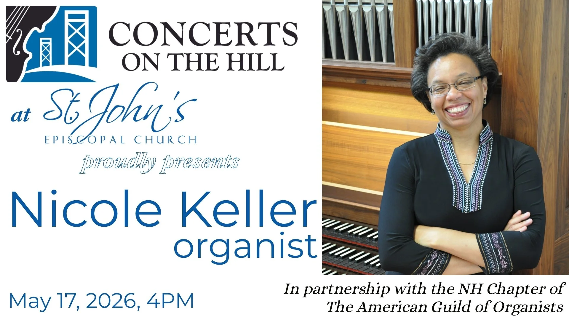 In collaboration with the New Hampshire chapter of the American Guild of Organists, St. John's Concerts On The Hill is proud to present Nicole Keller in recital here in our historic and beautiful sanctuary. Concertgoers will be treated to a performance unlike any other; Keller being hailed as "...an aggressive player with outstanding technique and fine musical sensibilities..." [The Chicago Crusader].
